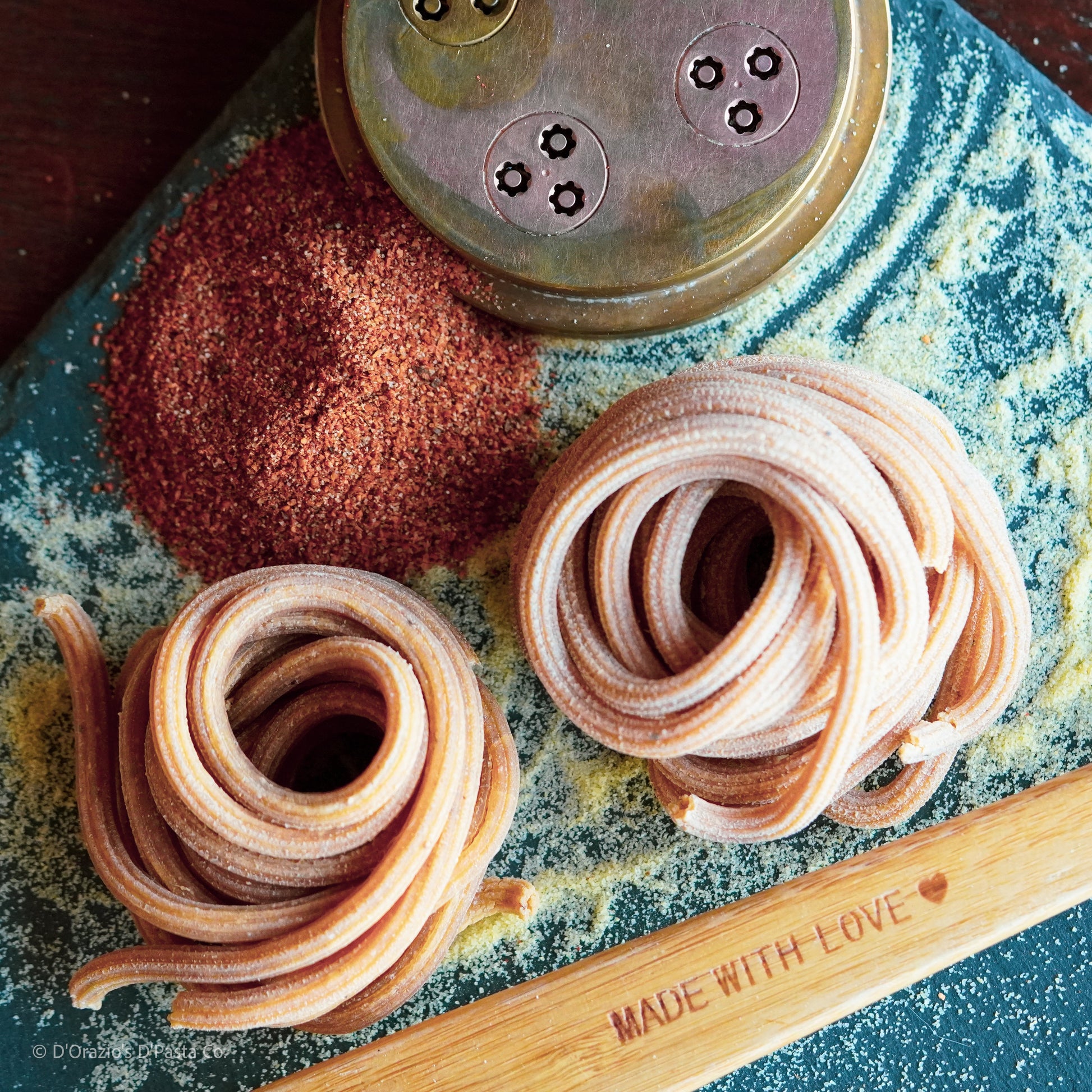 We stuck to a more rustic version of the bucatini in that it has a ridged exterior and is a thicker diameter than the modern bucatini on store shelves. The ridges on the exterior are much better at holding onto sauces while the thicker diameter provides a more satisfying bite.